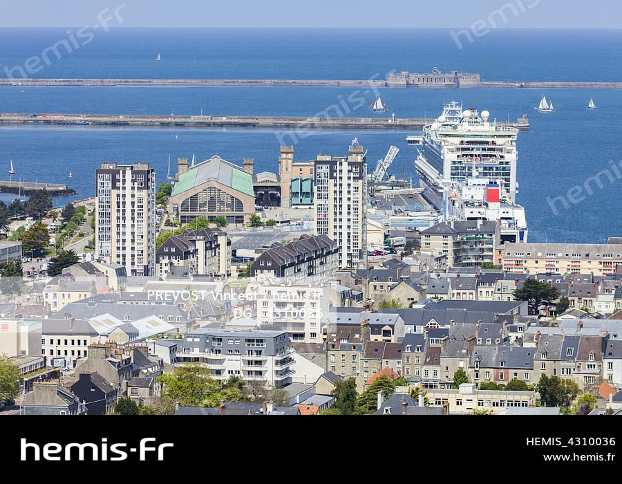 France, Manche (50), Cotentin, Cherbourg-Octeville, ancienne gare maritime réhabilitée en musée, appelée Cité de la Mer, et navire de croisière MS Azura de la compagnie P&O Cruise