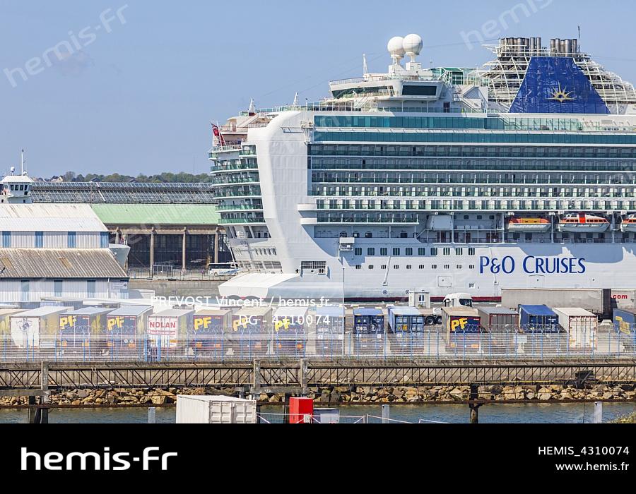 France, Manche, Cotentin, Cherbourg-Octeville, cruise ship MS Azura belonging to the company P&O Cruise, docked at former maritime passenger terminal, rehabilitated into a museum, called Cité de la Mer