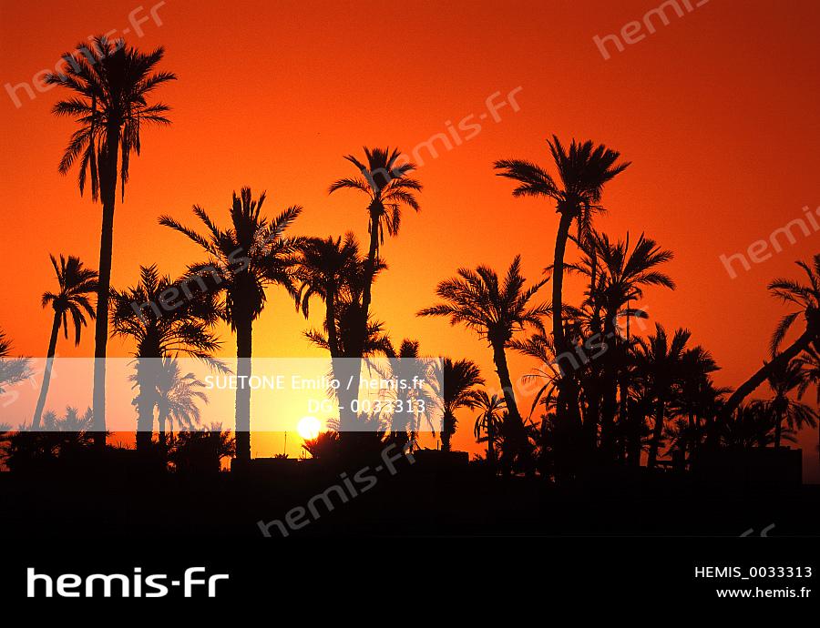 Morocco, Marrakesh, sunset on the palm grove