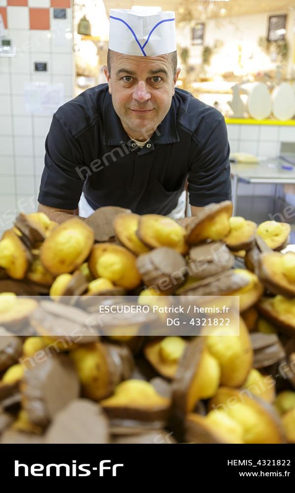 France, Meuse, Commercy, portrait of Stéphane Zins in front of a pile of madeleines on the packaging line in the shop and madeleine manufacturing workshop of Commercy La Boite à Madeleines of the Zins brothers, madeleiniers since 1951