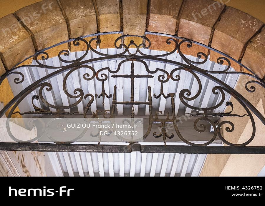 France, Rhône (69), Villefranche-sur-Saône, imposte en fer forgé de l'ancien Hôtel Dieu du XVIIe siècle