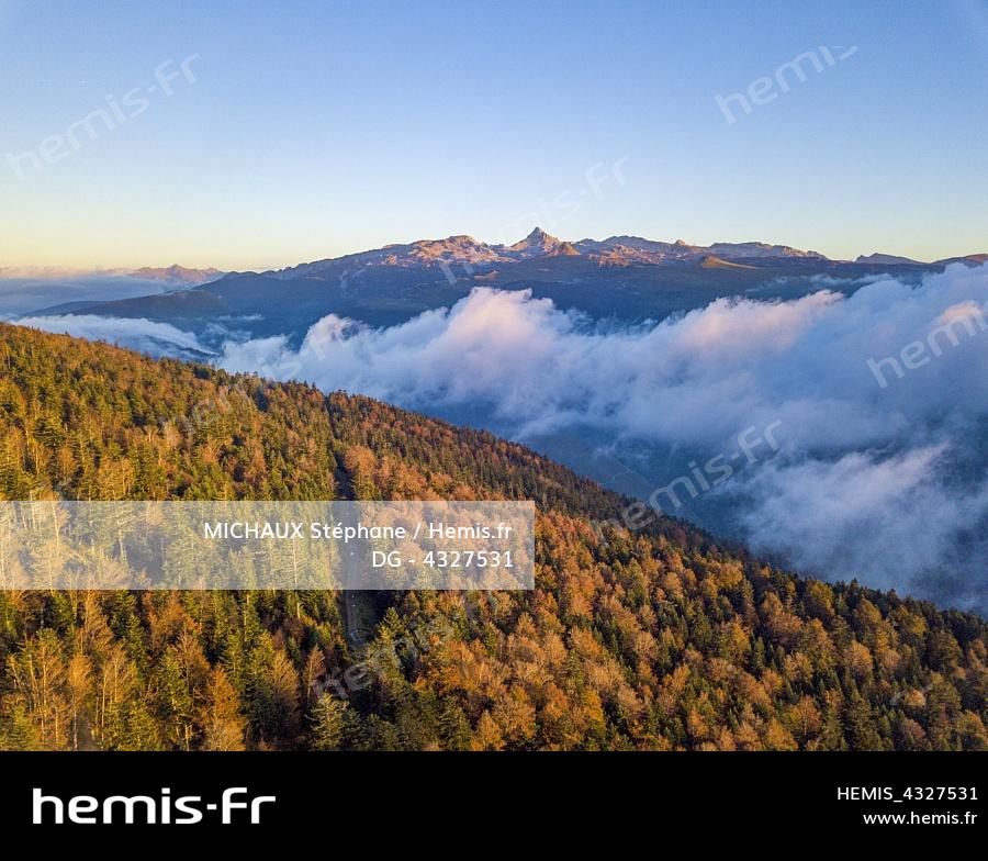 France, Pyrénées-Atlantiques (64), Une hetraie sapinière l'automne à Issarbe avec la mer de nuages (vue aérienne)