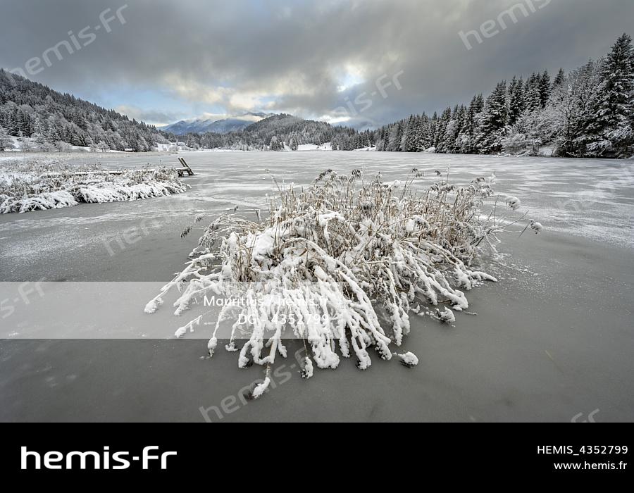 Île de roseaux couverte de neige sur la rive du Geroldsee / Wagenbrüchsee au petit hameau de Gerold entre Mittenwald et Garmisch-Partenkirchen Un ciel légèrement couvert au lever du soleil met en valeur les doux cours du paysage au bord du lac dans la neige