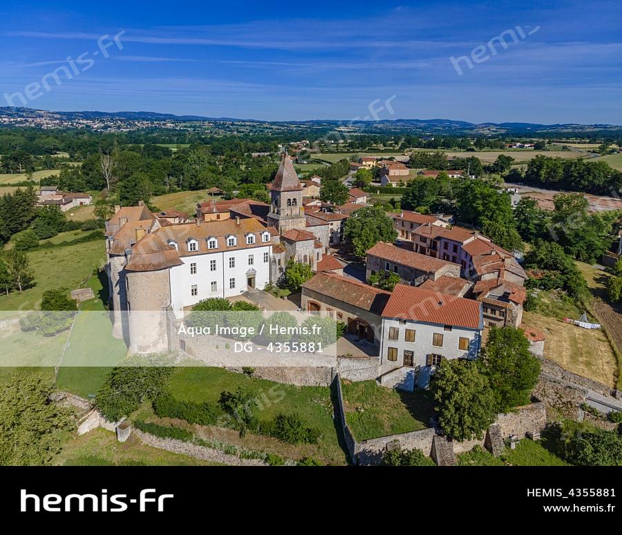 France, Loire (42), Pommiers-en-Forez dans la plaine du Forez, le prieuré de Pommiers fondé au IXe siècle (vue aérienne)