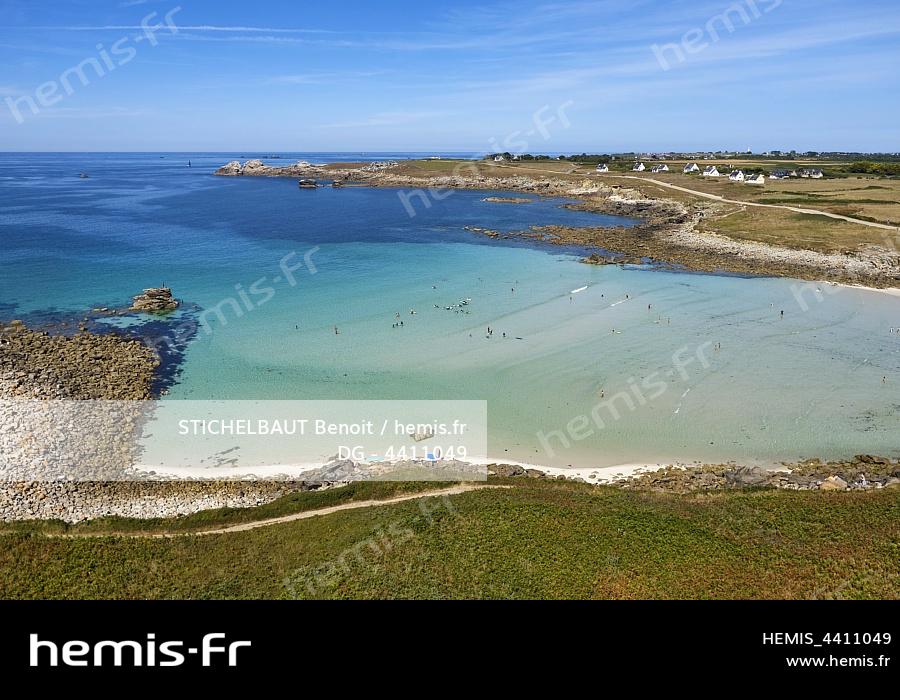 France, Finistere, Legendes Coast (cote des Légendes), Landunvez, Penfoul Beach, swimming and surfing at low tide in summer (vue aérienne)