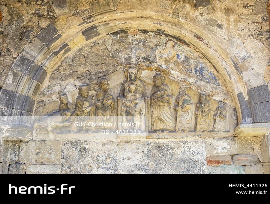France, Puy de Dome, Mozac, Saint Pierre and Saint Caprais church, Homage lintel, last Romanesque vestige of the cloister