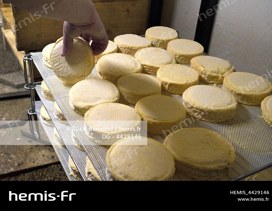 France, Haut-Rhin (68), Wasserbourg, Ferme-auberge Buchwald, le marcaire Michel Wehrey à la fabrication du fromage de munster AOP (lait de vache), munster de 15 jours toujours retourné régulièrement dans la cave d'affinage