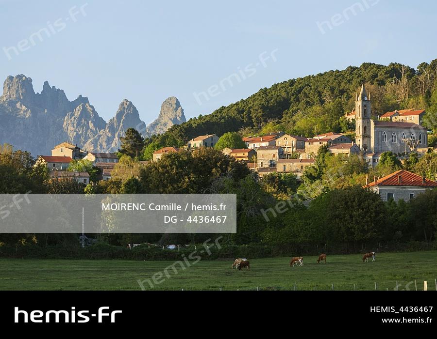 France, Corse du Sud, Zonza, view of the village, the Aiguilles de Bavella in the background
