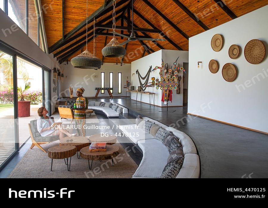 Senegal, Saloum delta listed as World Heritage by UNESCO, Palmarin, Patrick's lodge, European client chatting with a Senegalese housekeeper in wax outfit in a large living room with contemporary African decor