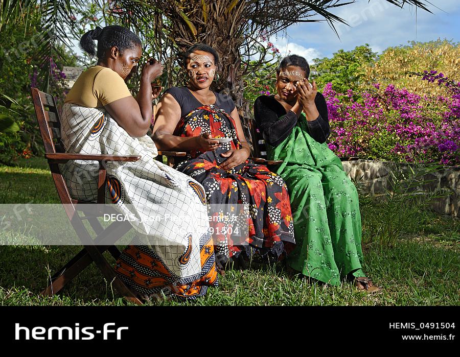 France, île de Mayotte, Nyambadao, femmes mahoraises en Salouva colorés (vêtement traditionnel) se maquillant, réalisant un masque de fête, le M'zinzano qui veut dire bois de santal en shimaoré, langue originaire du swahili