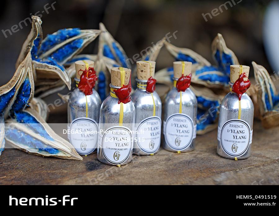 France, Mayotte island (French overseas department), Combani, bottles of ylang ylang flowers on a background of traveler's tree sundried, about 100 kg of flowers are necessary to produce 2,5 kg of Ylang Ylang oil