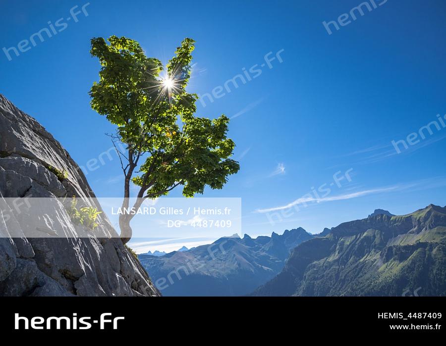 France, Haute Savoie, Aravis massif, Grand Bornand, Colombiere pass, Bargy massif, hike to the Montarquis valley, a solitary tree grows in the limestone lapiaz