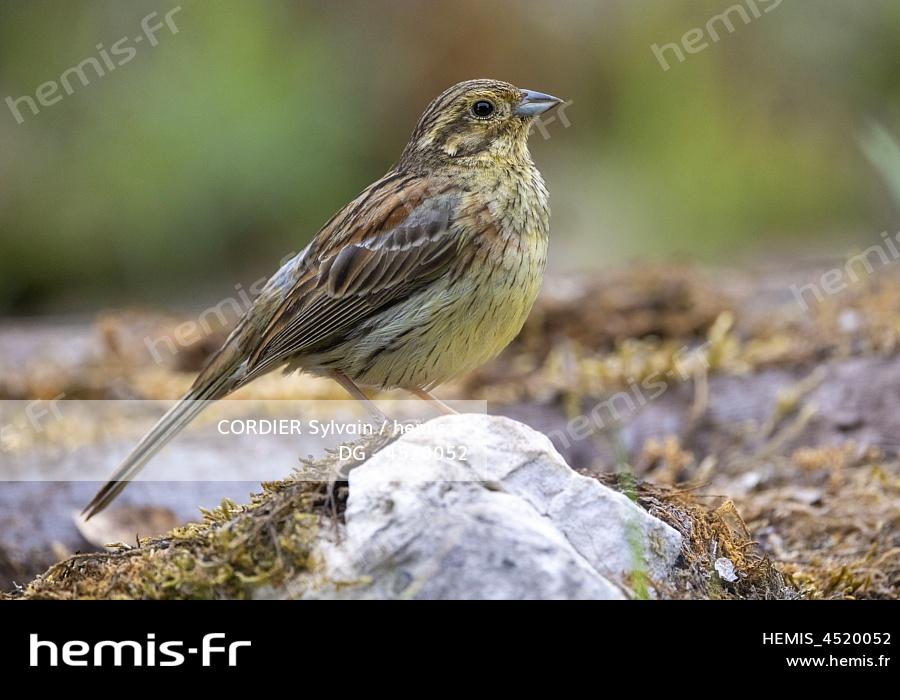 France, Aude (11), Bruant zizi (Emberiza cirlus), femelle adulte, posé au sol sur une pierre