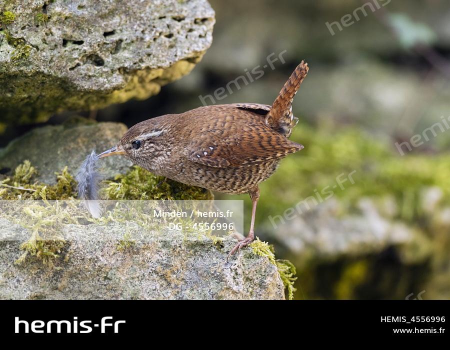 Eurasian Wren (Troglodytes troglodytes) carrying feather for nesting, Germany