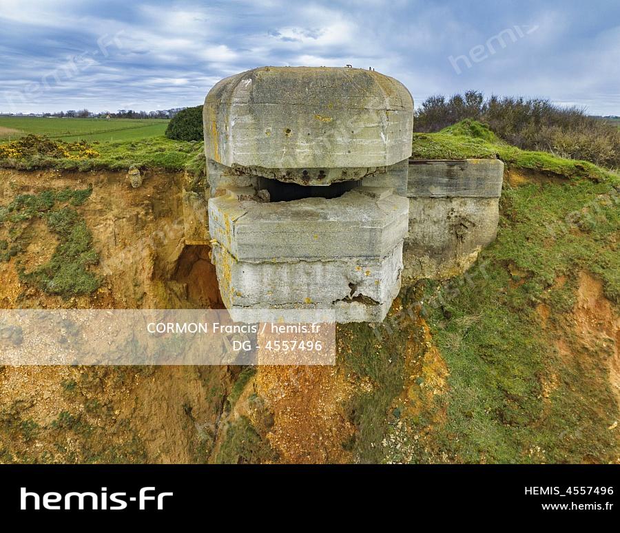 France, Seine Maritime, Heuqueville, Cote d'Abatre, the blockhouse of a German battery in the void following the erosion of the cliff (aerial view)