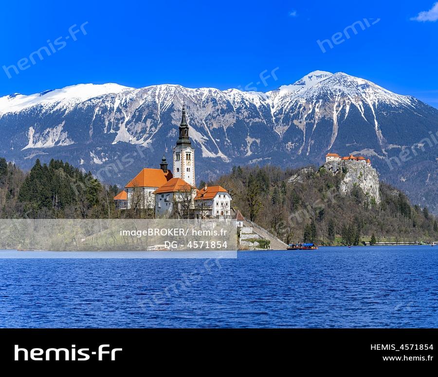 Château de Bled, église Sainte-Marie, église de pèlerinage de l'Assomption de la Vierge Marie, sur l'île du lac de Bled, lac Velda ou lac Felder, Blejsko jezero slovène, sur fond alpin, Bled, Haute-Carniole (Gorenjska), Slovénie, L'Europe