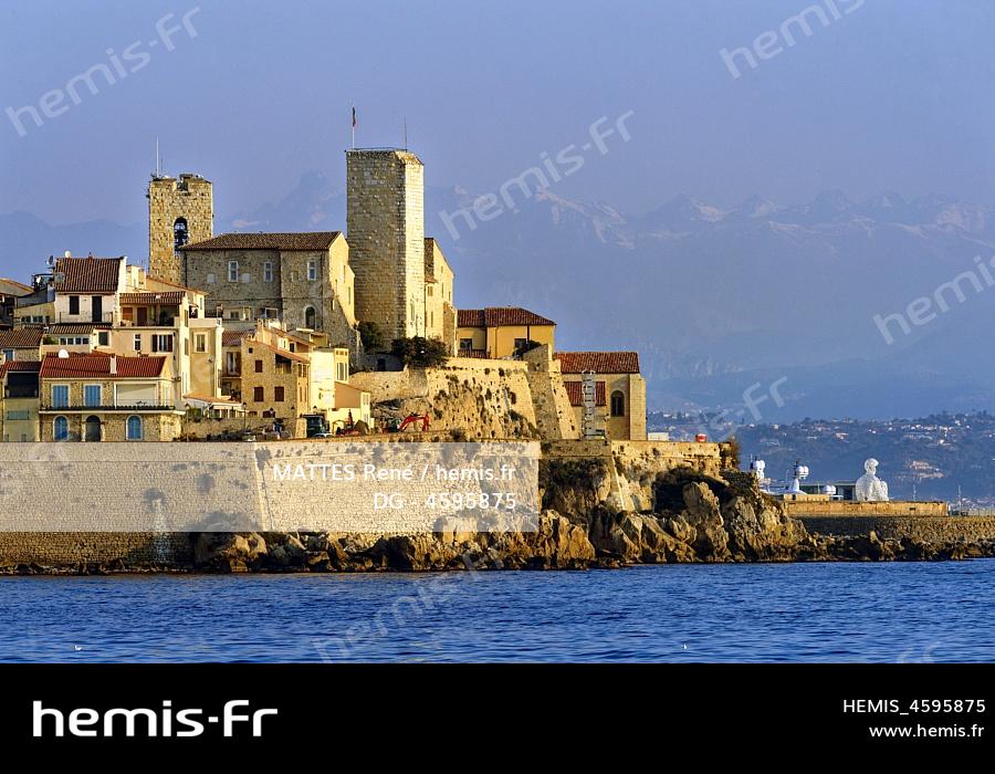 France, Alpes Maritimes, Antibes, the Old town and its Vauban ramparts letting appear the two Saracen towers of the Picasso Museum and the Cathedral Notre Dame of the Immaculate Conception