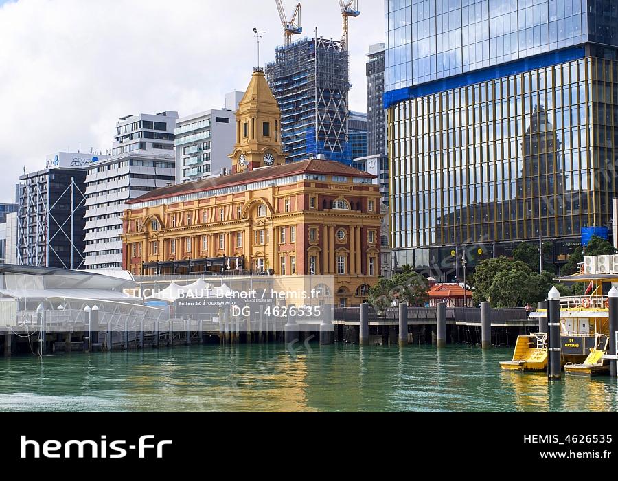 Nouvelle-Zélande, île du Nord, Auckland, Central Business District (ou CBD), le Ferry Building de style baroque édouardien, construit en 1912 en grès et brique, maintient toujours sa fonction initiale de terminal des ferries à destination de la Côte-Nord et les îles du golfe d'Hauraki
