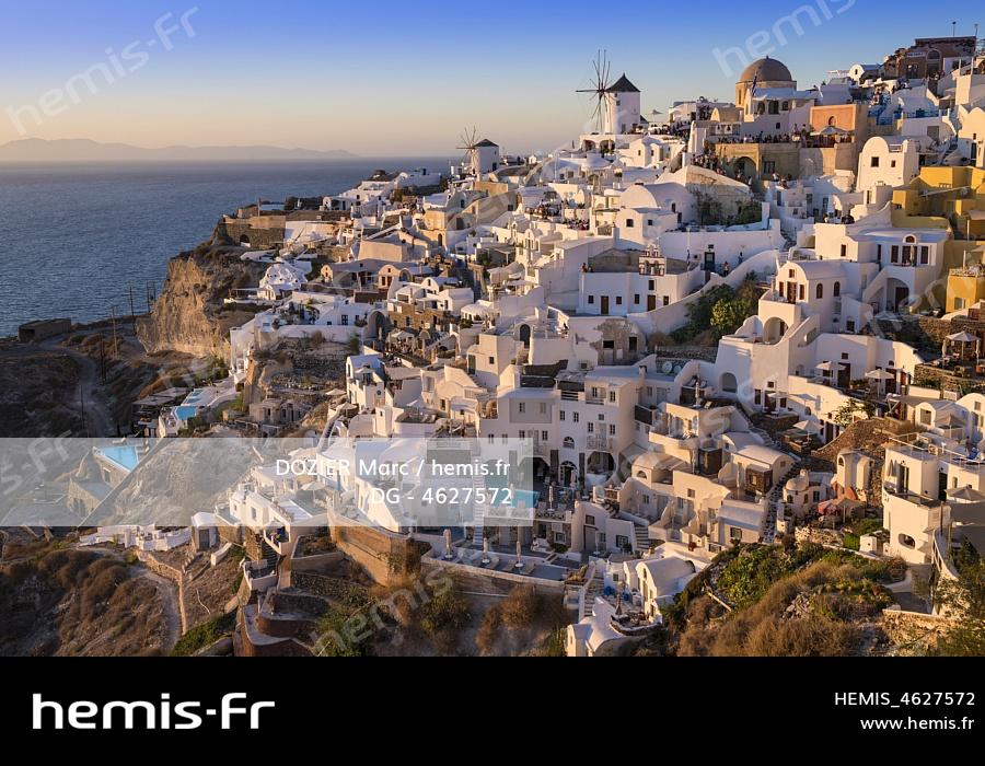 Grèce, archipel des Cyclades, île de Santorin, le village de Oia vu des ruines du château Agios Nikolaos