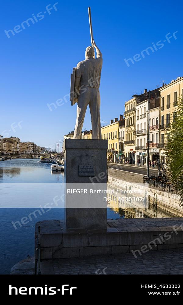 France, Hérault (34), Sète, Canal royal, la statue du jouteur oeuvre de Pierre Nocca domine le Cadre royal