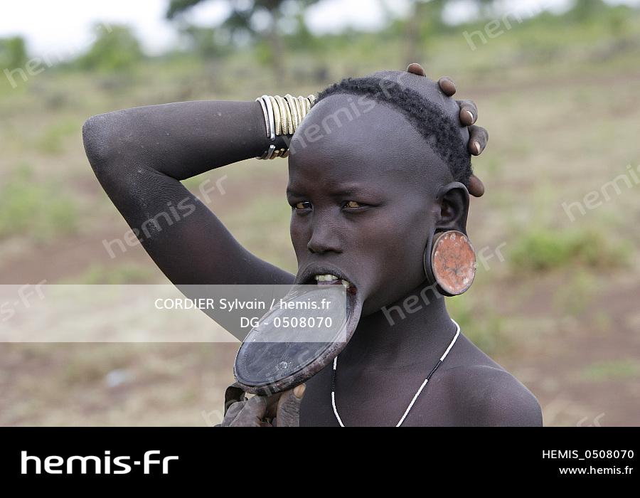 Ethiopia, Omo Valley, Mursi people, woman with ritual decoration, lip plate