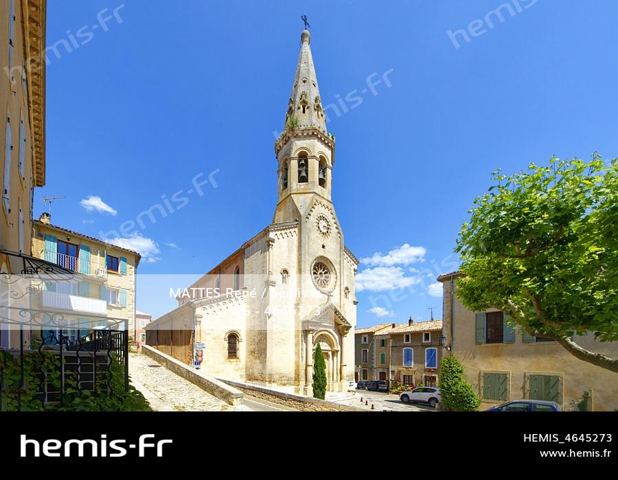 France, Vaucluse (84), Parc naturel régional du Luberon, Saint-Saturnin-lès-Apt, place de la Mairie, le clocher octogonal de l'église Saint Etienne possède un carillon de 11 cloches