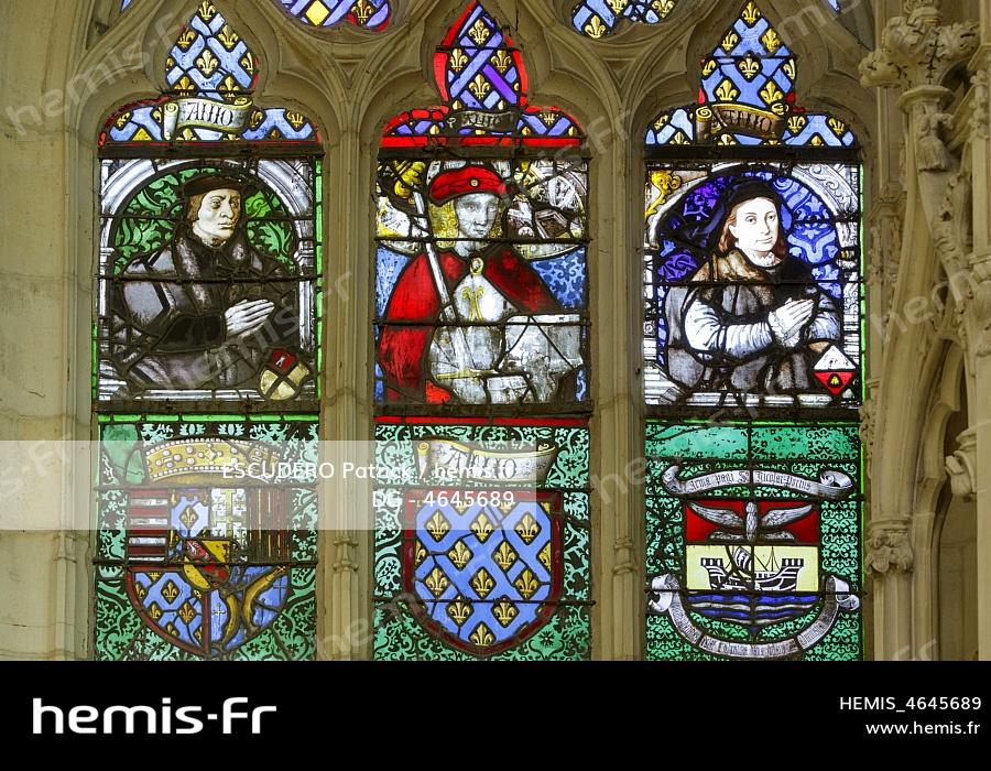 France, Meurthe et Moselle, Saint Nicolas de Port, Saint Nicolas de Port basilica built at the begining of the 16th century after the victory of Duke Rene the Second over Charles le Temeraire at the battle of Nancy thanks to the intercession of Saint Nicolas uprighted patron saint of the Lorraine region, national shrine of the inhabitants of Lorraine. Stained glass window of Saint Anne chapel, all the panels were made or reassembled around 1850 by Napoleon Rives and Desire Laurent. On the bottom level, from left to right the coat of arms of the Lorraine region headed by the crown of a marquis, probably the one of Francois de Lorraine son of Duc Antoine, the coat of arms of the Anjou region and those of the town of Saint Nicolas de Port all made during the late 19th century. On the second level from left to right, the portraits of a couple of rich merchants from Saint Nicolas de Port, Fiacre Feriet and his wife Jennon Thiriet with the bust of Saint Adrien attributed to a workshop from Troyes (1510-1520) of which only the bust remains