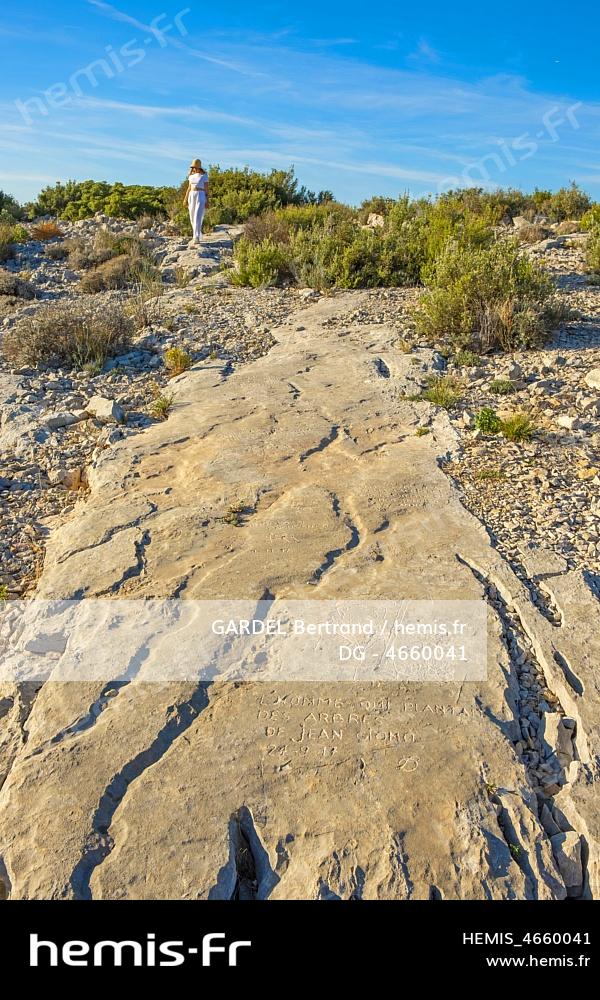 France, Bouches du Rhone, Aubagne, Marcel Pagnol trail, the engraved stones at the foot of Garlaban, works of art by Louis Douard