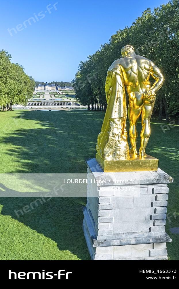 France, Seine et Marne, Maincy, Vaux le Vicomte castle, sculpture of Hercule Farnese in the castle park, formal gardens designed by Andre Le Notre and southern facde of the castle in the background