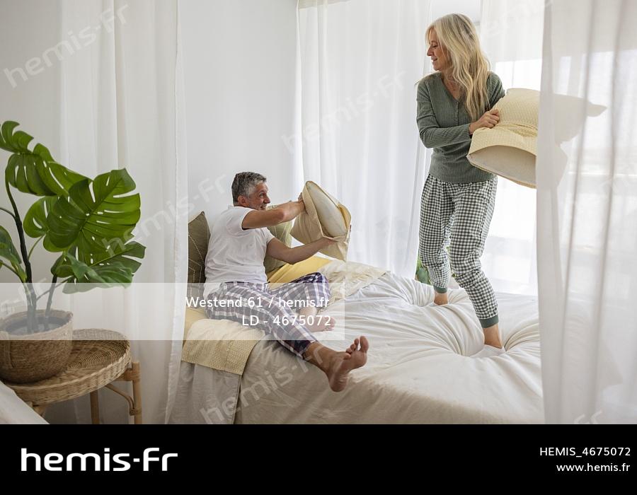 Man and woman pillow fighting on bed at home