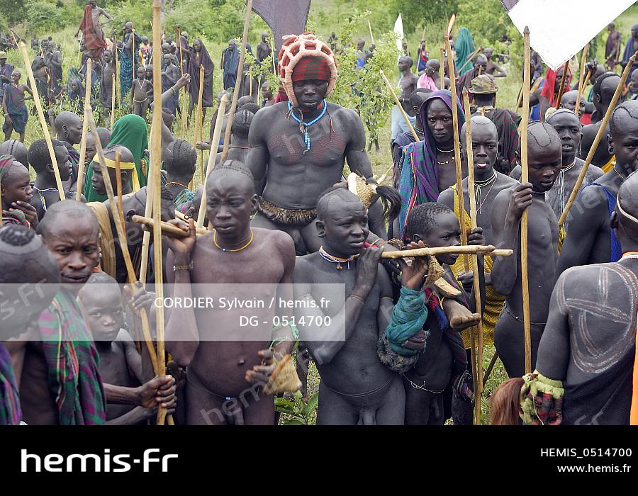 Ethiopie, basse vallée de l'Omo, classée Patrimoine Mondial de l'UNESCO, cérémonie du Donga chez les Surma, combat au bâton entre guerriers de villages voisins