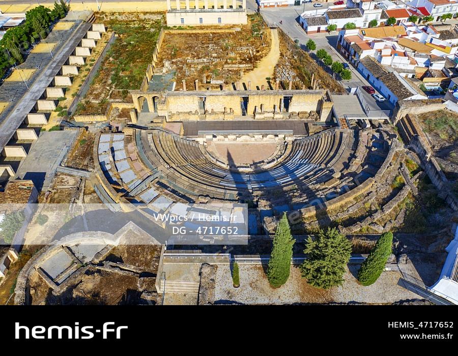 Vues aériennes des ruines romaines d'un amphithéâtre romain, Italica, province de Séville, Andalousie, espagne. L'amphithéâtre d'Italica était à l'époque le troisième plus grand de l'Empire romain, avec une capacité de 25 000 personnes, soit environ la moitié de la capacité du Colisée de Rome. Cette taille est surprenante étant donné que la population de la ville à l'époque n'était estimée qu'à 8 000 habitants, et montre que l'élite locale a démontré un statut qui s'étendait bien au-delà d'Itálica à travers les jeux et les représentations théâtrales qu'elle finançait. comme magistrats et fonctionnaires. De la même époque se trouve le luxueux quartier annexe avec plusieurs villas ostentatoires décorées de splendides mosaïques encore visibles aujourd'hui. La Maison des Oiseaux a été la première maison entièrement fouillée à Itálica. Cette villa aristocratique offre une série de mosaïques précieuses d'excellente qualité, véritable trésor de cette ville antique. L'amphithéâtre Itálica a également servi de décor à la septième saison de la célèbre série Game of Thrones.
