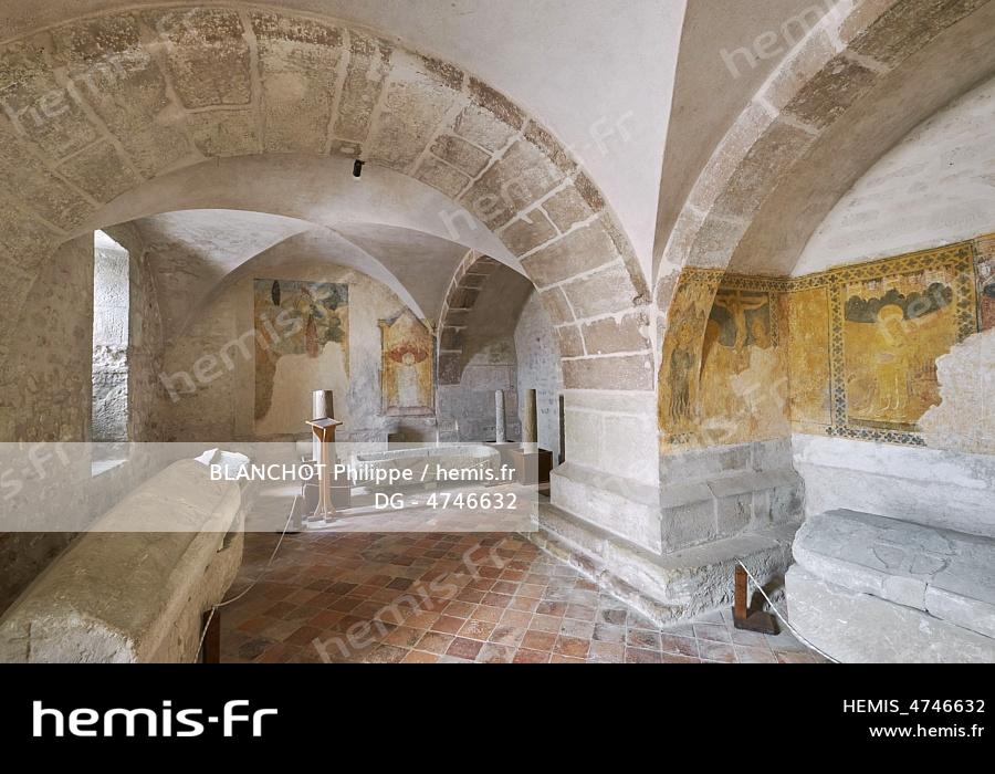 France, Vosges (88), Remiremont, église abbatiale Saint-Pierre, crypte, chapelle Saint-Antoine du XIe siècle, sarcophages du début du Moyen-Age, fresques du XVe siècle