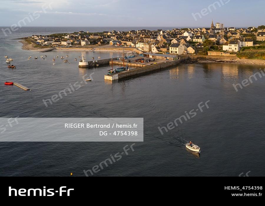 France, Finistère (29), Mer d'Iroise, archipel de Molène, Ile de Molène, le village et le port au petit matin (vue aérienne)