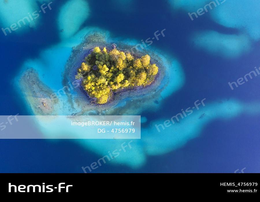 Île Ludwig dans le lac Eibsee, près de Grainau, Werdenfelser Land, vue aérienne, haute-Bavière, Bavière, Allemagne, Europe