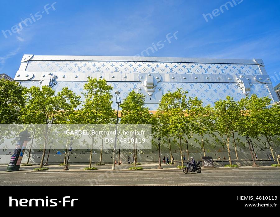France, Paris (75), avenue des Champs-Elysées, siège de Louis Vuitton, enveloppé dans une malle