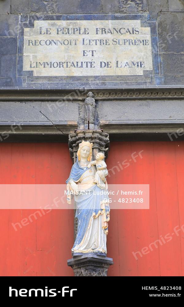 France, Puy de Dome, Clermont Ferrand, Notre-Dame de l'Assomption cathedral, facade with revolutionary inscription dedicated to the Cult of Reason and the Supreme Being: ‘The French people recognise the Supreme Being and the immortality of the soul’.