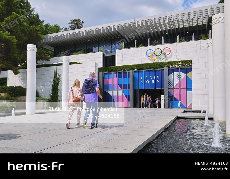 Switzerland, Canton of Vaud, Lausanne, the Olympic museum in the district of Ouchy, Paris Olympique exhibition, an immersive journey, the history of the three Parisian editions of the Olympic Games of 1900, 1924 and 2024, the facade