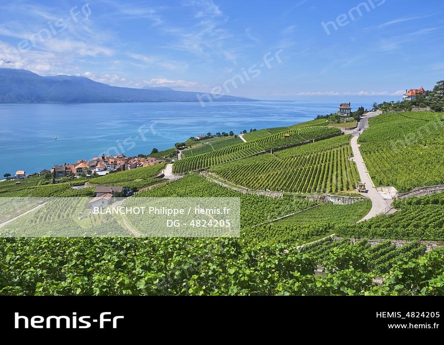 Switzerland, Canton of Vaud, Lavaux terraced vineyard listed as World Heritage by UNESCO, it extends from Vevey to Lutry along Lake Geneva and over 806 ha, Rivaz village
