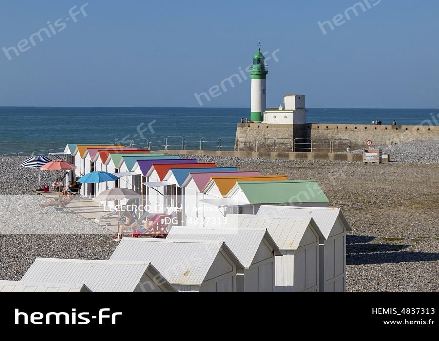 France, Seine-Maritime (76), Le Tréport, cabines de plage, jetée et phare
