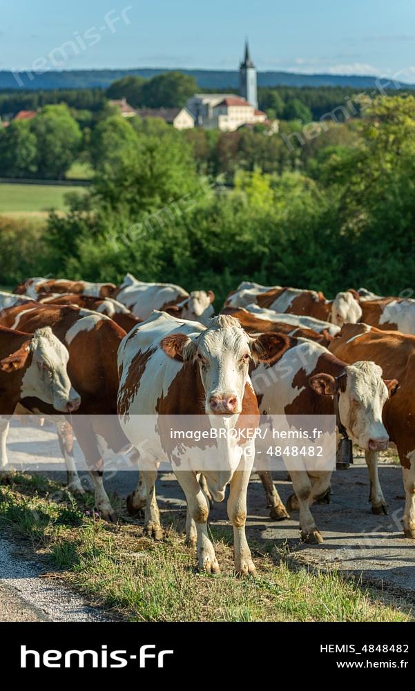 Vaches marchant vers leur pâturage près d'un village. Vache Montbéliarde dans le Jura en France. Europe