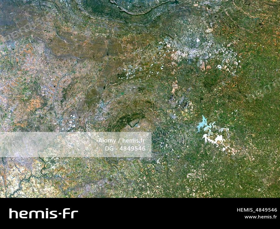 Afrique du Sud, image satellite en couleurs réelles du cratère provoqué par l'impact de la météore de Vredefort qui constitue à ce jour le plus gros cratère d'impact de météorite visible sur Terre