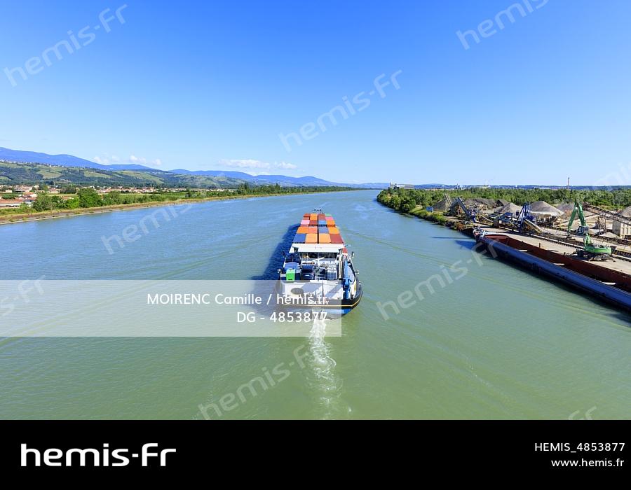 France, Isere (38), Salaise sur Sanne, Site industriel et portuaire de Salaise Sablons, port de commerce sur le fleuve Rhone, peniche porte conteneur