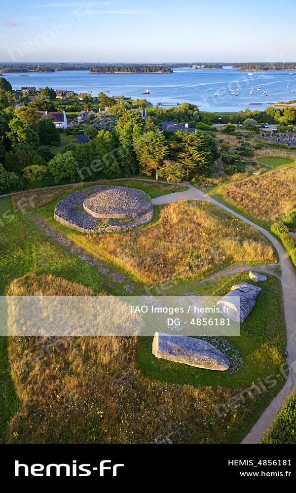 France, Morbihan (56), site mégalithique classé Patrimoine Mondial de l'UNESCO, Locmariaquer, le grand menhir brisé d'Er Grah et le cairn de la Table des Marchands (vue aérienne)