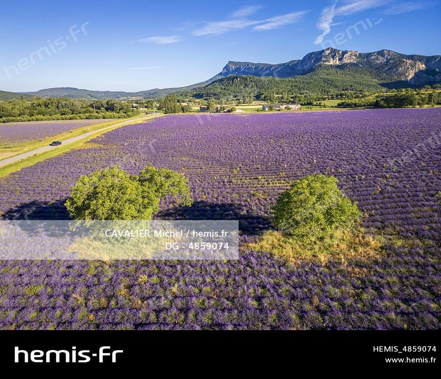 France, Drôme (26), Drôme Provençale, Saoû, noyers dans un champ de lavandes en fleurs au bord de la route D538 entre Saoû et Bourdeaux (vue aérienne)
