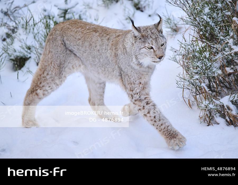 Lynx eurasien (Lynx lynx) marchant dans une forêt enneigée en hiver, Bavière, Allemagne, Europe