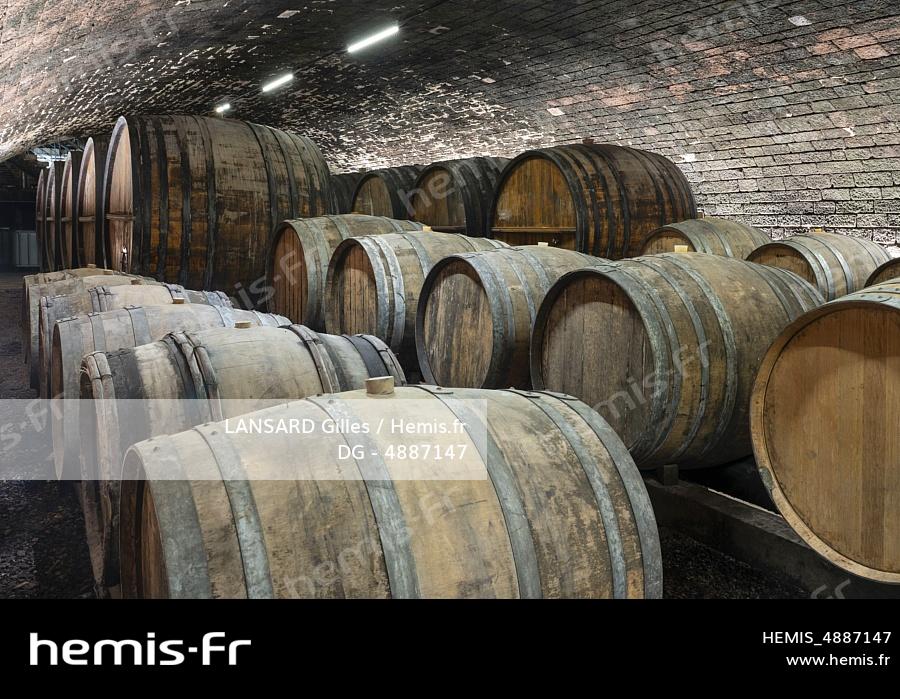 France, Jura, Arbois, the vaulted brick cellars of the Domaine de la Pinte in organic production filled with oak barrels for maturing the wine