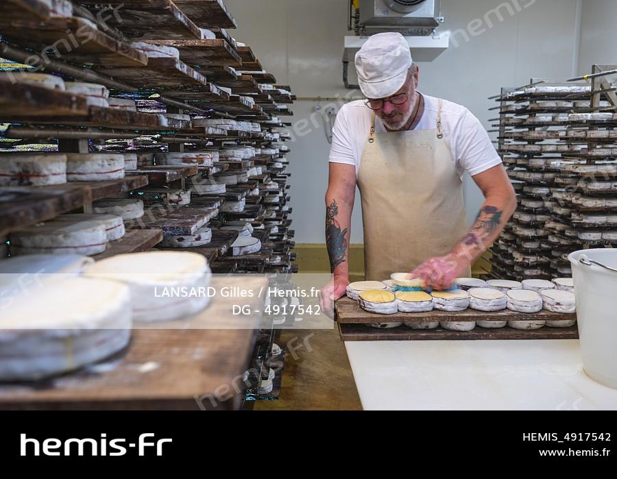 France, Doubs (25) Métabief, la fromagerie Sancey-Richard, la fabrication du Mont d'Or, travail sur les croutes à la cave, brossage des croutes