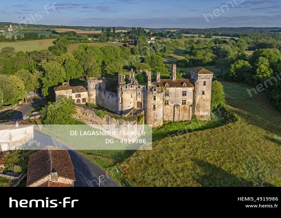 France, Dordogne, Green Perigord, Mareuil, Castle of Mareuil, barony of Périgord (aerial view)