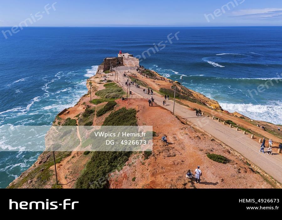 Aerial view of the The Nazare Lighthouse - Farol de Nazare -, where people gather to watch the big wave surfing in Praia do Norte (North Beach), listed on the Guinness World Records for the biggest waves ever surfed, formed under the influence of the Nazare Canyon, Portugal